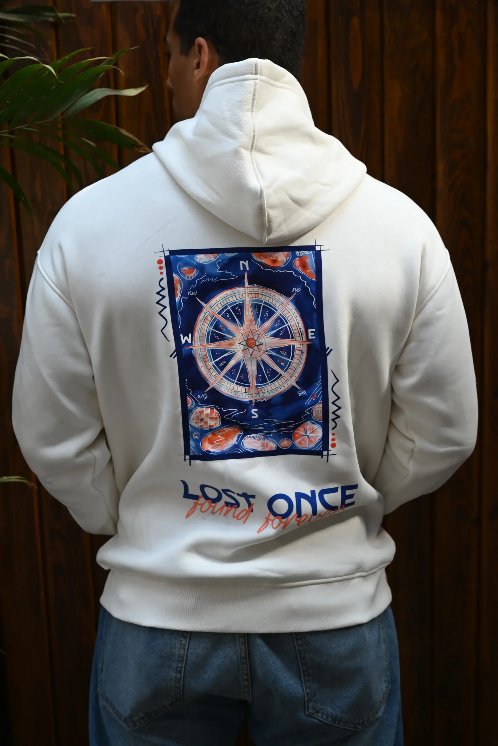 • Back print featuring a detailed navy & orange compass artwork with “LOST ONCE” text